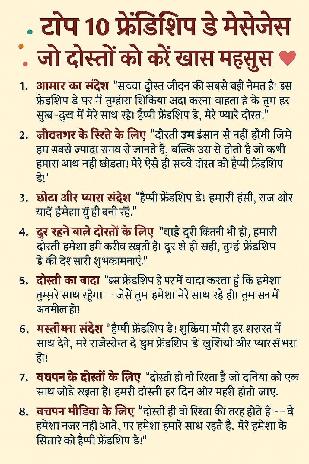 दोस्ती जीवन का सबसे अनमोल रिश्ता है। फ्रेंडशिप डे हमें इस खूबसूरत रिश्ते का जश्न मनाने का मौका देता है। चाहे आपका सबसे अच्छा दोस्त आपके पास रहता हो या दूर, एक प्यारा सा संदेश उसके चेहरे पर मुस्कान ला सकता है। यहाँ हम आपके लिए लाए हैं टॉप 10 फ्रेंडशिप डे मैसेजेस, जिन्हें आप अपने दोस्तों को भेजकर उनका दिन खास बना सकते हैं।